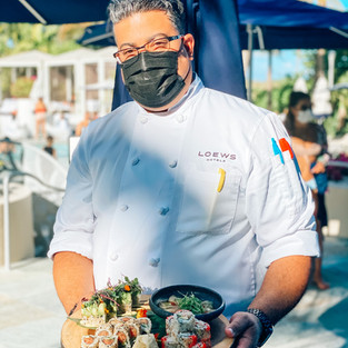 The next day we were totally spoiled in a daybed at the SOAK Cabana area. The staff working was exceptional and took such great care of us the entire time. They brought us out a wonderful bottle of Rosé to kick off the day. We had an opportunity to meet their director of food and beverage, the sushi chef and a few other staff members. They were all so incredibly welcoming and accomodating. We were in the perfect spot of the cabana area and had an equal amount of shade and sun so we were able to stay cool despite the crazy hot temperatures. We also ended up making friends with the group on our side and had such a great time. It was a full day of Rosé, tasty food, sunshine and fun. Literally couldn't ask for a better pool day. I've had the ceviche each time I've been at Loews and it is great. It's light and served with plantains which makes it the perfect poolside snack. The conch fritters are a little heavy but super tasty. The chicken rice bowl was probably our favorite. It's a good midday meal especially if you are day drinking at the pool. They also sent out an empanada-style dish. They were great but they were a little heavy for a pool day. All of the food on the property is light and fresh. While all of the food was great, the sushi was probably my favorite part of our food experience at the cabanas. Sushi is one of my main food groups. The chef was very kind and brought out a full delectable selection and explained each item to us. We devoured it all and shared a few bites with our new friends.